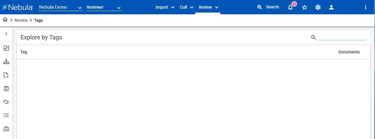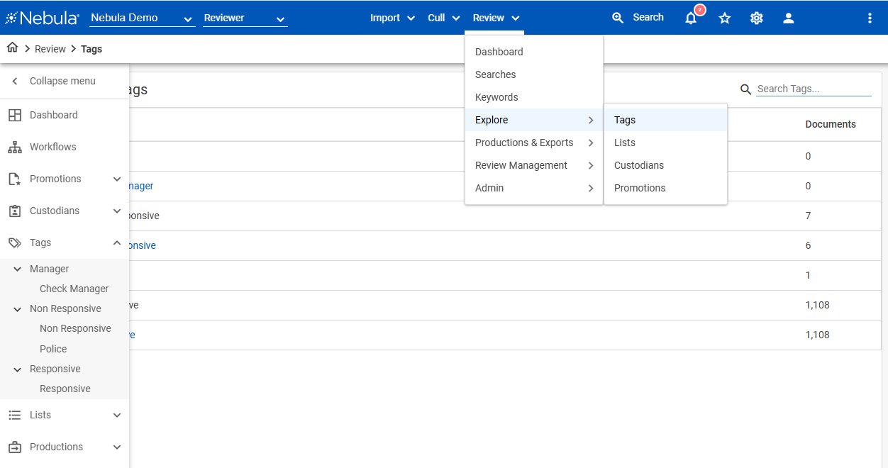 - Users with Explore by Tags permission can view the Tags side-panel dropdown and the Explore by Tags page (Review > Explore > Tags).