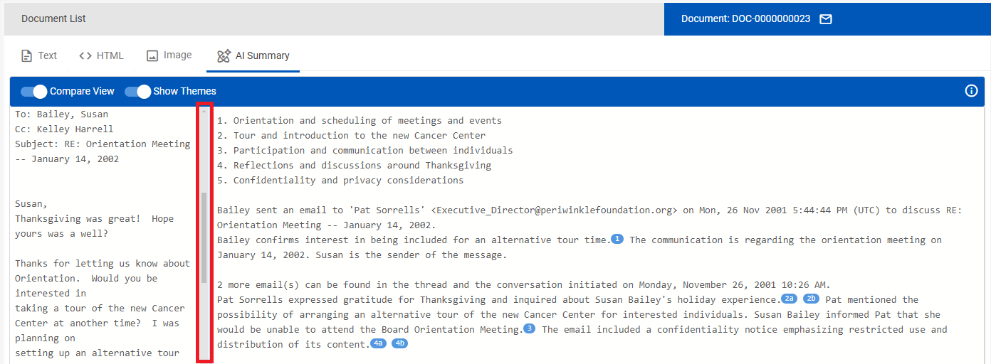 With AI Summarization, large language models (LLMs) enable you to create instant summaries of extracted text from email and non-email documents (such as Microsoft Word, Excel, PowerPoint, and Chat files) in your data. Summaries can viewed on the Document Viewer AI Summary tab. The top five themes of the document can be viewed or hidden in the summary.