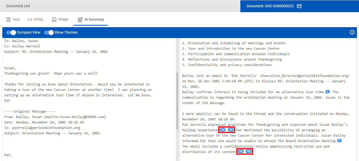 With AI Summarization, large language models (LLMs) enable you to create instant summaries of extracted text from email and non-email documents (such as Microsoft Word, Excel, PowerPoint, and Chat files) in your data. Summaries can viewed on the Document Viewer AI Summary tab. The top five themes of the document can be viewed or hidden in the summary.